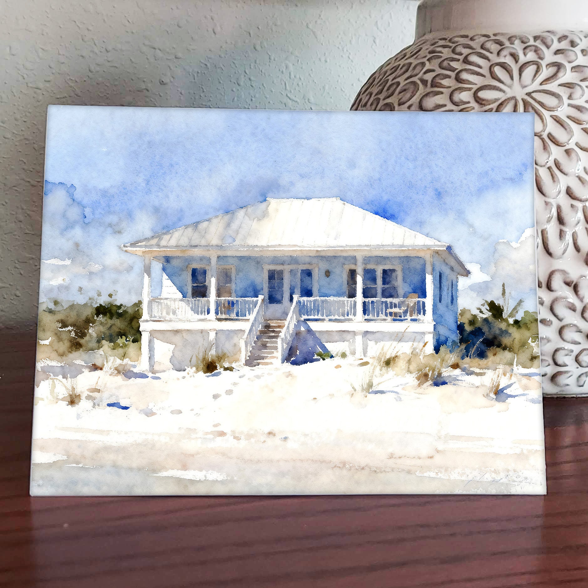Beachy Watercolor-Style Coastal Beach House Art
