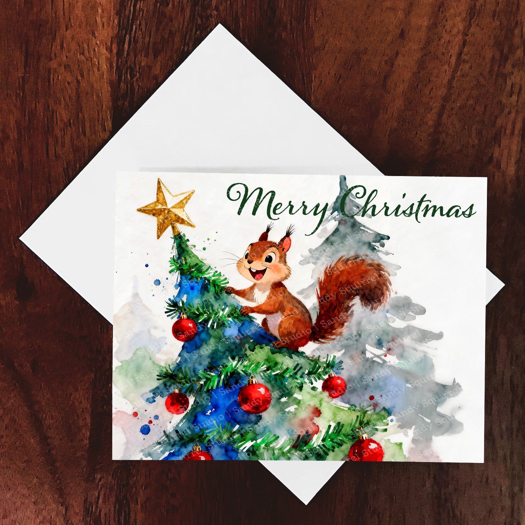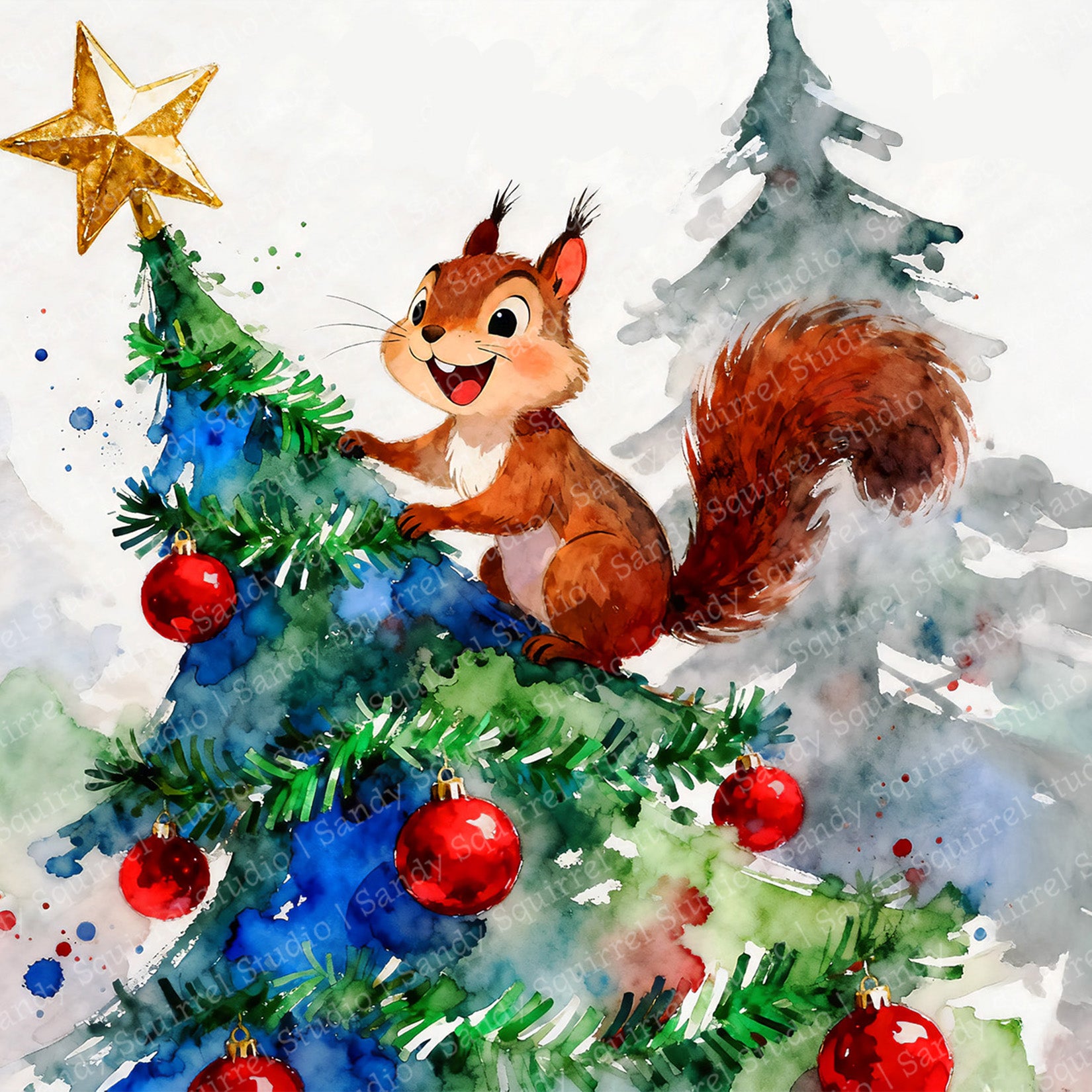 Squirrely Xmas Watercolor-Style Squirrel Christmas Art